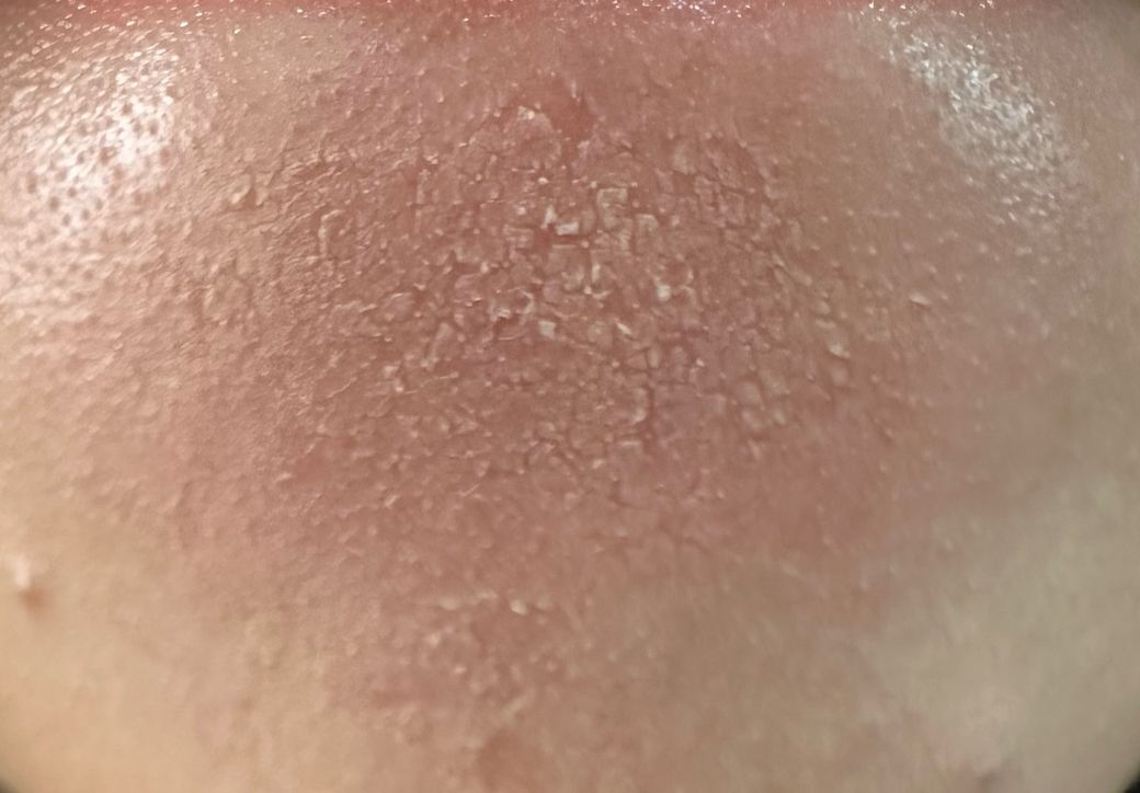 ※ 사진에서도 건조각질이 넓게 부스러지는 형태가 보이는데, 지루성 피부염에서 자주 보이는 모습입니다.
