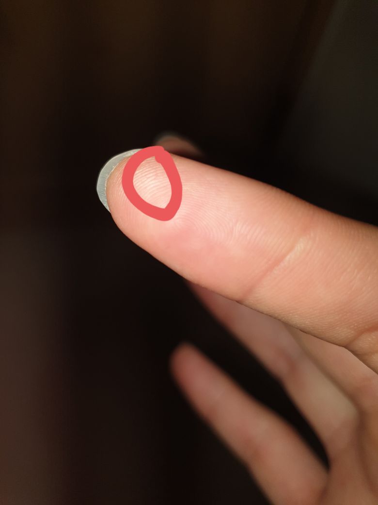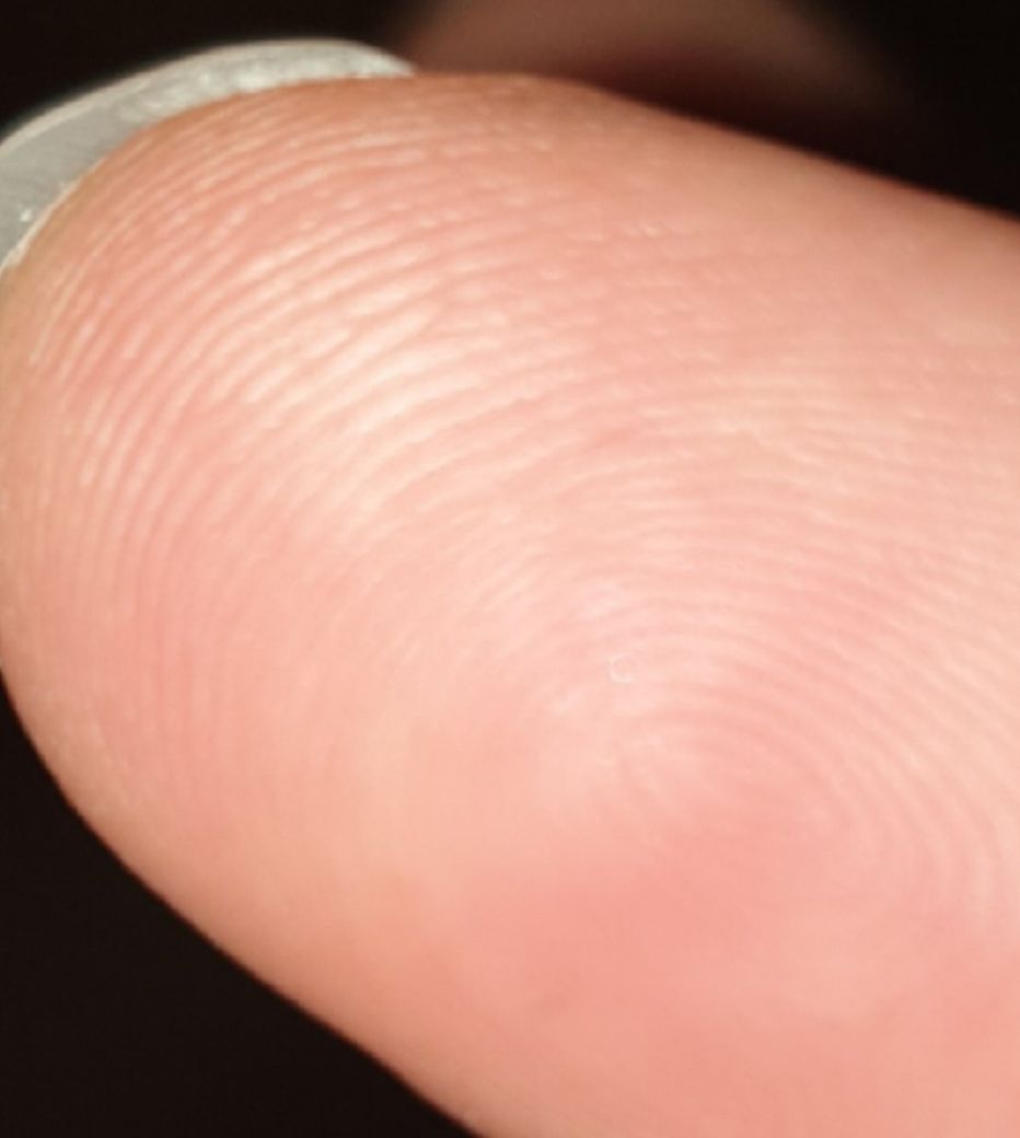 손가락에 다른 부위보다 약간 흰 부분이 있는데(동그라미 친 부분)-육안으로는 큰 차이는 아니고 빛을 비춰보면 주변보다 조금 더 흽니다