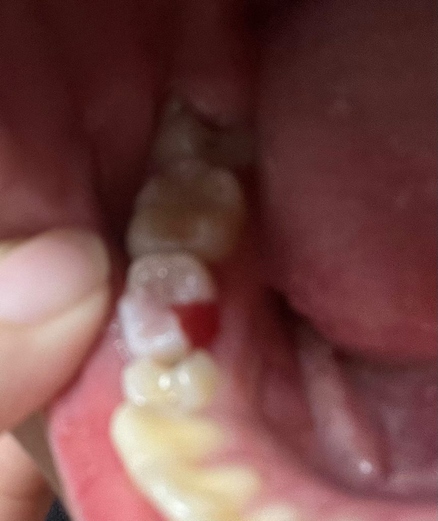 현재 사진으로 보아서는 유치로 보여집니다. 다만 후속 영구치가 있는지가 중요하며 후속 영구치가 존재한다면 해당 치아는 발치하면 될 것으로 보입니다. 가까운 치과 방문 후 해당 부위에 대한 평가를 받아보시길 바랍니다.