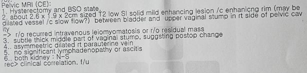 사진에 기재된 판독 내용을 정리하면 다음과 같습니다. 자궁적출술 및 양측 난소난관절제술 이후 상태이며, 방광과 질상부 사이 우측 골반강에 약 2.6 × 1.9 × 2 cm 크기의 T2 저신호 고형 병변이 관찰됩니다. 조영 시 가장자리에 약한 조영증강이 있고, 내부는 비교적 균일합니다. 영상의학과에서는 재발성 정맥내 평활근종증(intravenous leiomyomatosis) 또는 잔류 종괴 가능성을 감별로 제시했습니다. 유의한 림프절 비대나 복수는 없고, 양측 신장은 정상입니다.