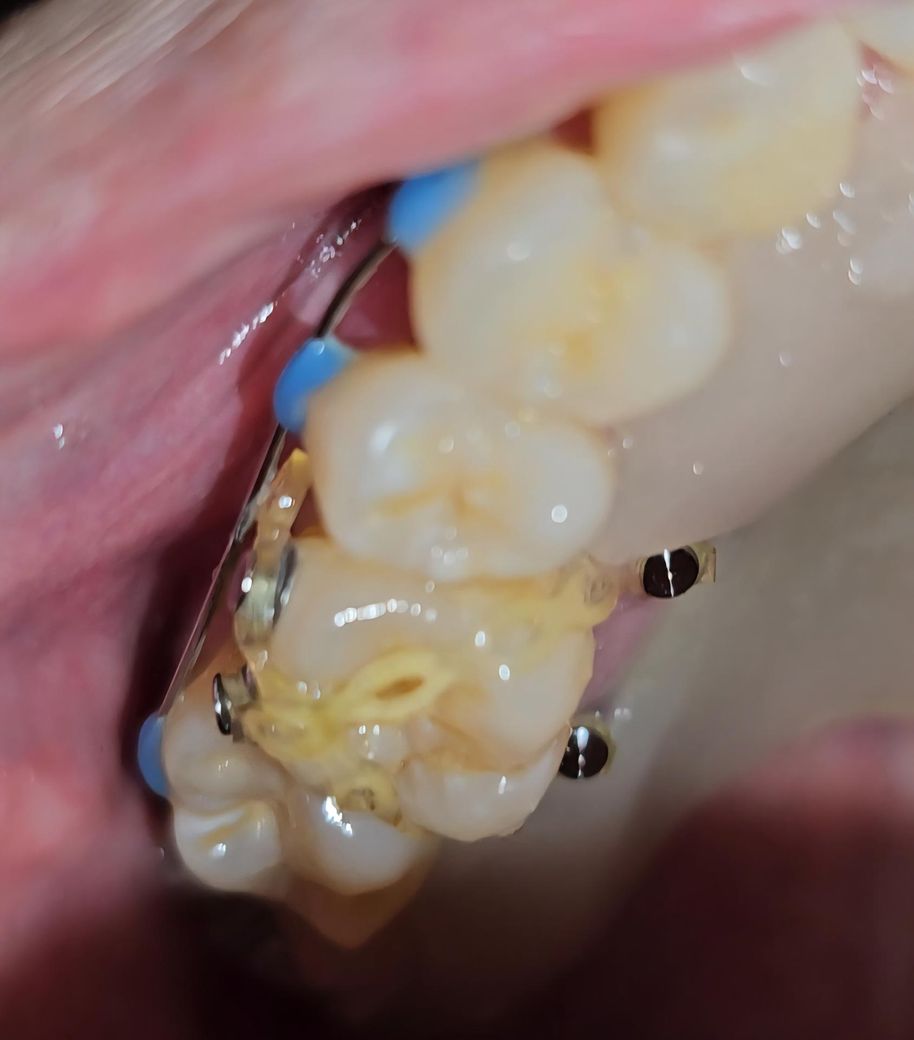 입천장 안쪽에 스크류 두개 어금니 바깥쪽에 고정장치 두개 그리고 고무줄로 교정 중입니다.