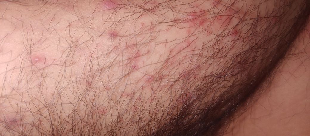 사진으로 보았을 때는 모낭염과 함께 모낭 주변부위로 습진이 생긴 것 같습니다.