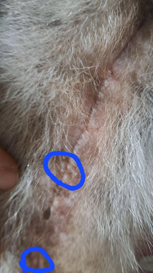 그런데 2월 초중반쯤에 개 수술부위를 만지다가 가시같은 게 박혀있어서 당기니 수술 실이 남아있는 건지 짧게 실이 나왔습니다 이렇게 나온 실은 3~5mm 정도였고 2개 뽑았습니다