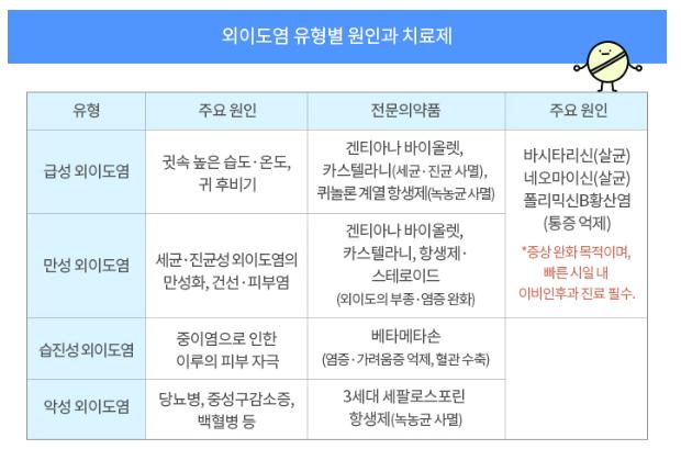 하지만 외이도염 전기가 아니라면 이들과 약제 (항생제 및 스테로이드)를 같이 사용을 해야 합니다. 따라서 외이도염이 의심되는 경우는약을 도포하는 것보다는 진료를 받으시는 편이 좋겠습니다.