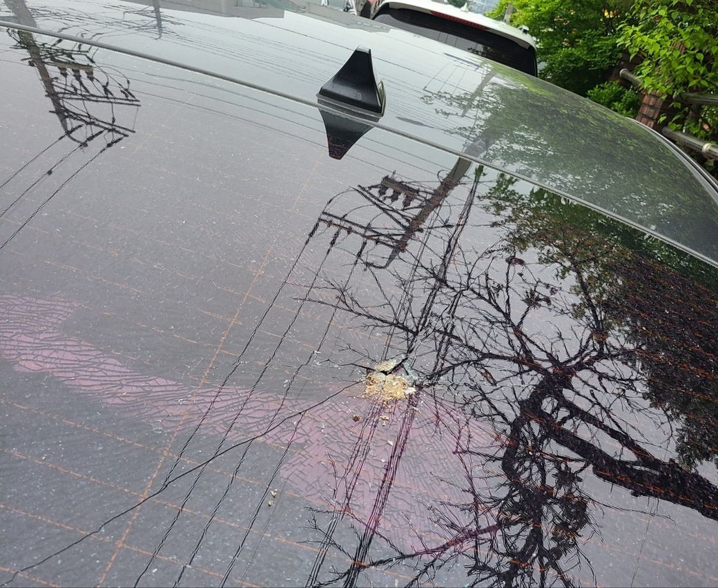 테슬라 차량이 아니시면 누군가 고층에서 구슬같은것을 던졌거나 새의 딱딱한 배설물로 파손이 갔을수 있어요
