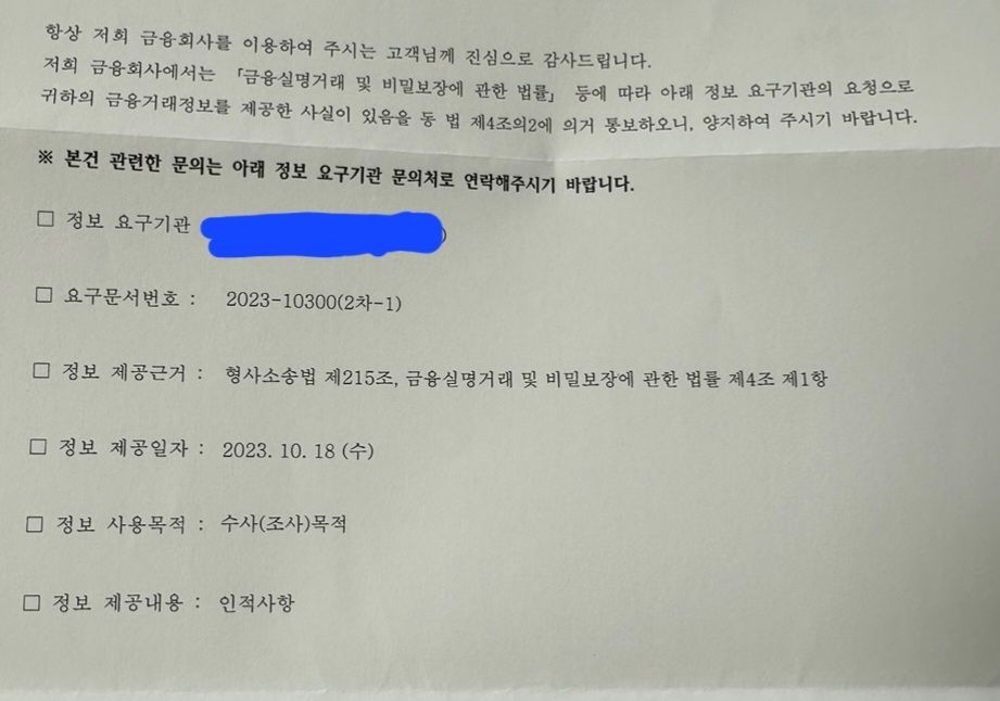 금융거래정보 제공사실 통보서 2차-1