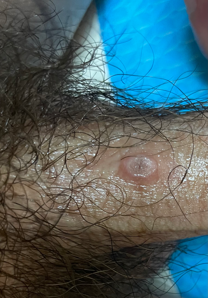아까 글을 올렸는데 사진이 흐리개 나와서 다시 올려요 여드름은 아니고 증상은 아무증상 없습니다. 물집 인가요? 최근에 성 접촉은 없습니다.