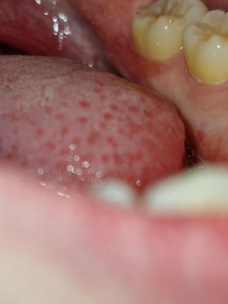 피곤으로 인해서 몸의 면역력이 떨어지게되면 혀의 미뢔조직에 염증이 생기면서 사진과 같이 붉은 점이 생길수 있습니다.
