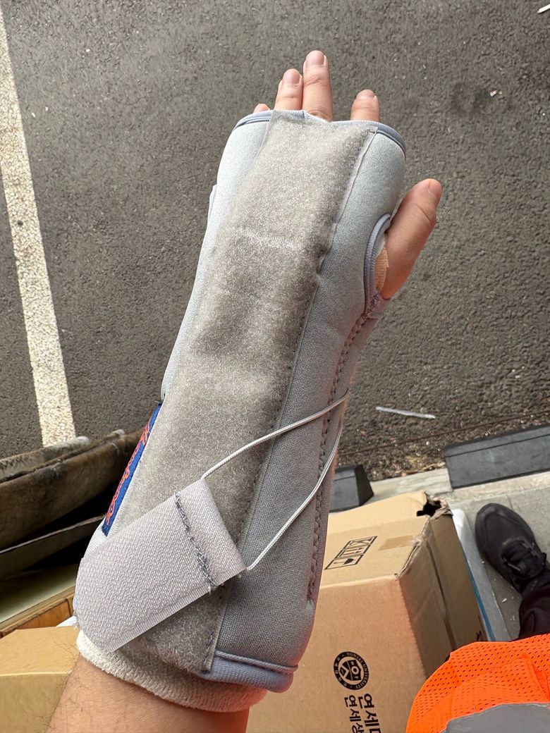 사진을 보면 손목 고정용 보조기인것으로 보이며 딱딱한 지지대가 손바닥쪽을 향하게 착용하셨다면 큰 문제느 ㄴ없을 것으로 생각됩니다.