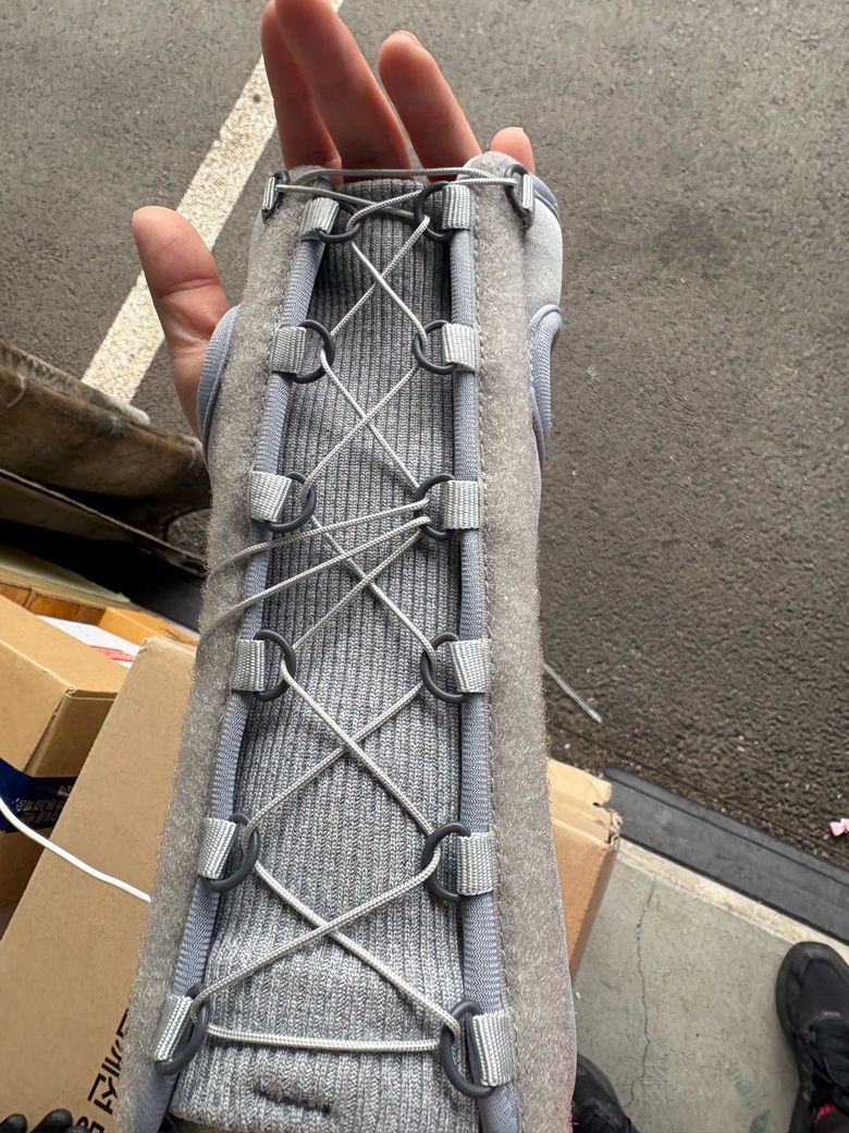 사진처럼 손등 쪽에 딱딱한 지지대(부목)가 오는 방식을 '손등 측 부목'이라고 하며, 손등 쪽 힘줄의 손상이나 특정 부위의 골절 시, 손목이 아래로 굽혀지는 것을 방지하여 정중신경 압박을 줄이려 할 때 사용하기도 합니다.