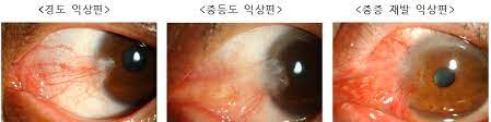 익상편은 대개 항생제 연고나 안약을 점안하고 치료용 렌즈를 착용하는 등의 치료로 호전됩니다. 눈을 비비거나 자극하지 않도록 주의하시고, 증상이 호전될 때까지는 가급적 눈에 화장품을 사용하지 않는 것이 좋겠습니다.