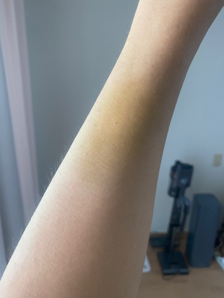 주사 부위에 멍이 들고 회복이 되어가는 과정일 가능성이 높아 보입니다. 그냥 두어도 특별한 문제 없이 스스로 서서히 회복되면서 원래 피부 상태로 돌아갈 가능성이 높습니다.