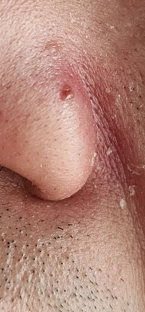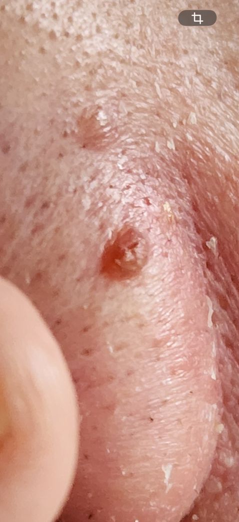 반면 기저세포암 같은 피부암도 “잘 낫지 않고 반복되는 병변, 쉽게 출혈”이라는 특징을 가질 수 있어 완전히 배제할 수는 없습니다. 다만 사진상 전형적인 궤양이나 가장자리 말림 같은 악성 소견은 뚜렷하지 않아 가능성은 상대적으로 낮아 보입니다.