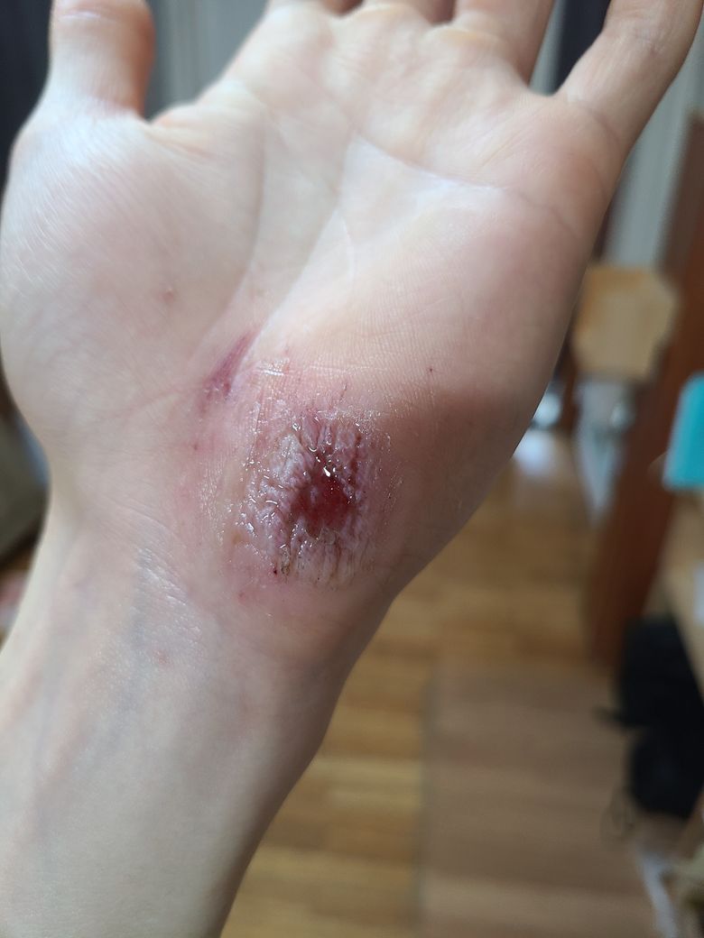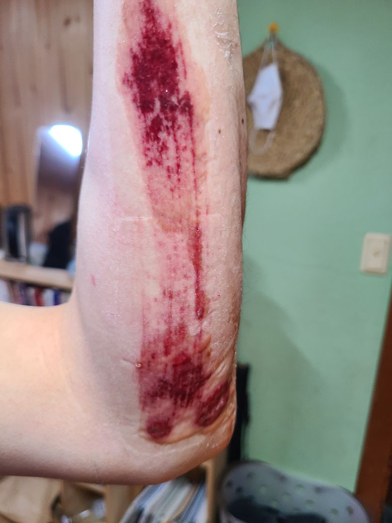 자전거를 타다 시멘트바닥에서 넘어져서 상처가 생겼습니다. 대처법에 대해 잘 모르고 병원도 멀어서 상처를 소독하고 습윤밴드를 붙였어요. 당시 이물질은 최대한 제거했는데 그래도 사이사이에 모래와 모래와 같이 갈려서 회색이된 피부가 꽤 있었어요. 새살이 돋으면서 회색피부는 떨어져나가겠지 싶었는데 찾아보니 제거하는게 좋다고 하더라고요...