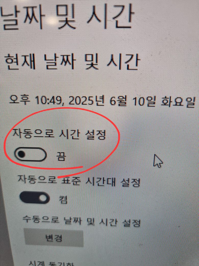 그리고 제어판에서 날짜와 시간 설정으로 들어가서 자동 시간 설정을 끄세요.