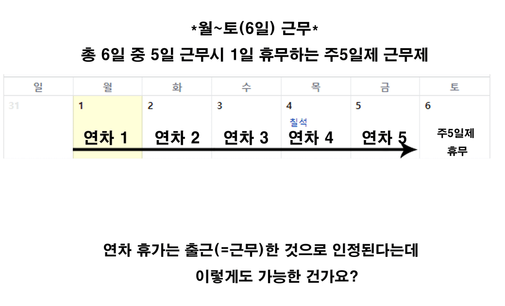 Q1) 연차 5개 연속 사용(근무인정) + 주5일 근무에 따른 휴무 = 총 6일 휴무 인가요?