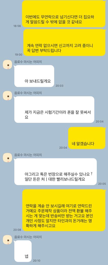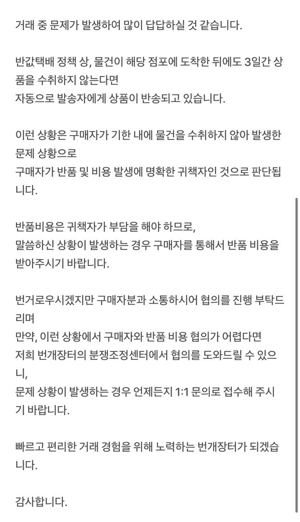저는 번개장터라는 중고거래 앱에서 프로상점으로 핸드메이드 주문제장 상품을 판매하고 있습니다. 구매자는 제주도에 산다 하였고 편의점 반값택배로 받으신다고 하셨습니다. 반값택배는 점포 도착 후 4일이 지나면 보낸 사람에게 반송이 되는 시스템입니다. 11월 29일에 점포 도착하였고 4일이 지난 12월 5일에 수령해 가라고 연락을 했지만 3일이 지나도 연락두절이어서 다시 찾아가시라고 연락드렸습니다. 그제서야 보고 타지를 가야한다는 말로 그 다음날이 수령해 가겠다고 했지만 수령하지 않아서 12월 9일에 편의점에서 반송접수를 했습니다. ‘일주일이나 흘렀는데 구매자가 수령을 안 해서 결국 저는 정산도 받지 못 하고 반송비 7,000원을 지불해야 하길래’ 반송비를 입금하라 하였지만 또 구매자는 연락두절이 되고 결국 배송 보낼때 적힌 전화번호로 카톡을 하니 그제서야 답을 하여 본인이 시험기간이라 최대한 빨리 돈을 보내겠다 하였지만 다시 일주일이 지난 현재 아직도 입금을 안 해주십니다.. 택배 반송은 곧 저희 지역으로 올 것 같아 지불해야하는 상황이고요