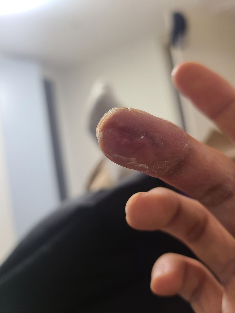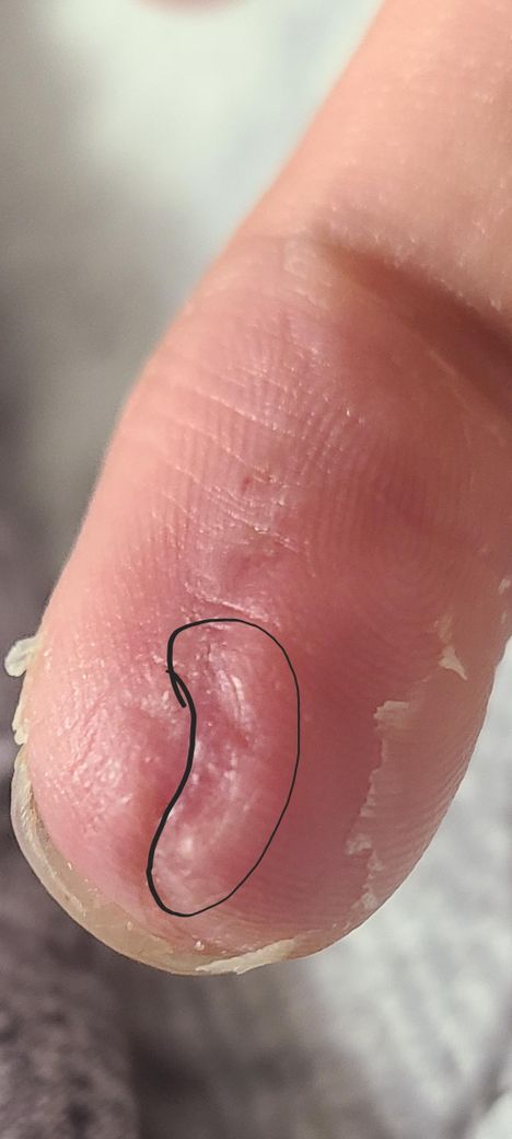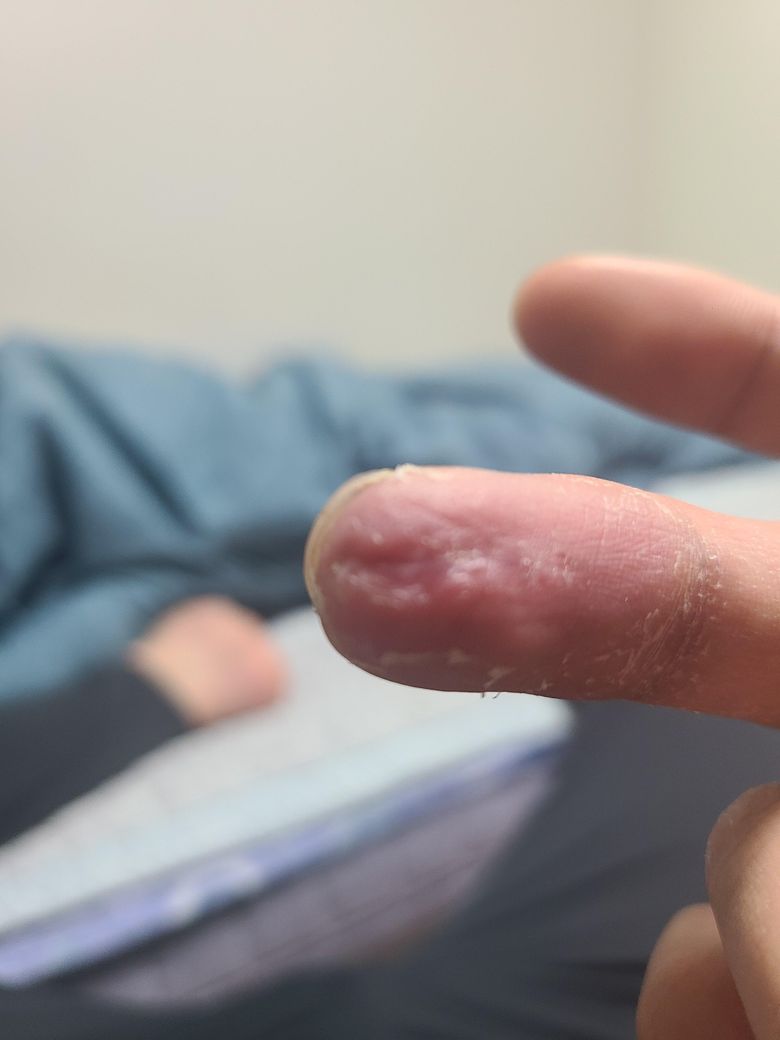 여러가지 문제를 의심해 볼 수 있고 사진상 정확한 상태를 알 수는 없지만 흉터조직일 가능성이 존재하며 만약 통증이 오랫동안 지속되시거나 심해지신다면 가까운 병원에 방문하시어 상태 검사 받아보시고 상태에 맞는 치료 및 처치등을 받아보시는게 좋을 것으로 생각됩니다.