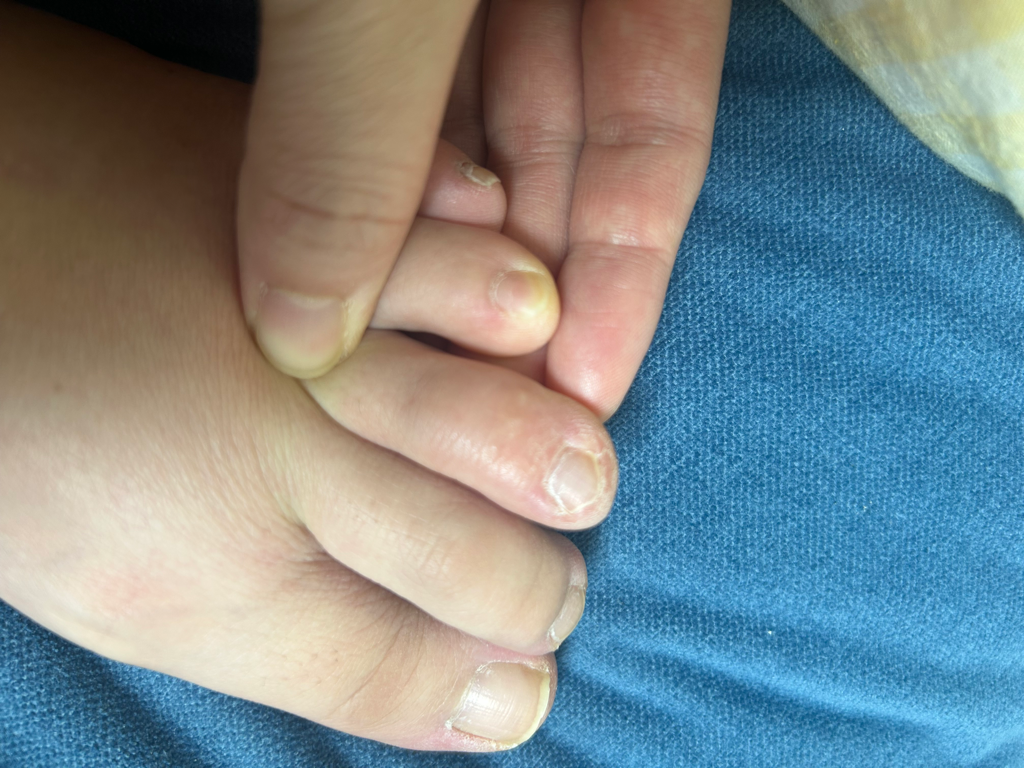 한포진으로 생각됩니다. 많이 가려우실텐데 바르는 연고는 전신 흡수가 거의 없어서 임신중에도 안전하니 염려하지 마시고 피부과 가보시기 바랍니다.