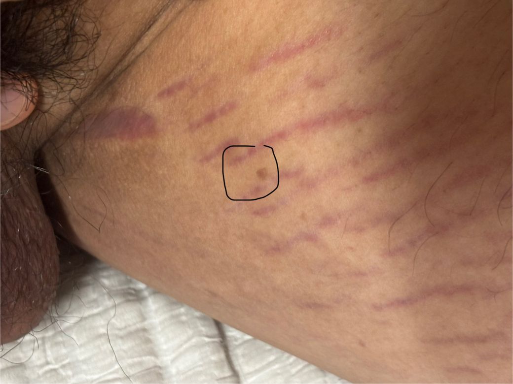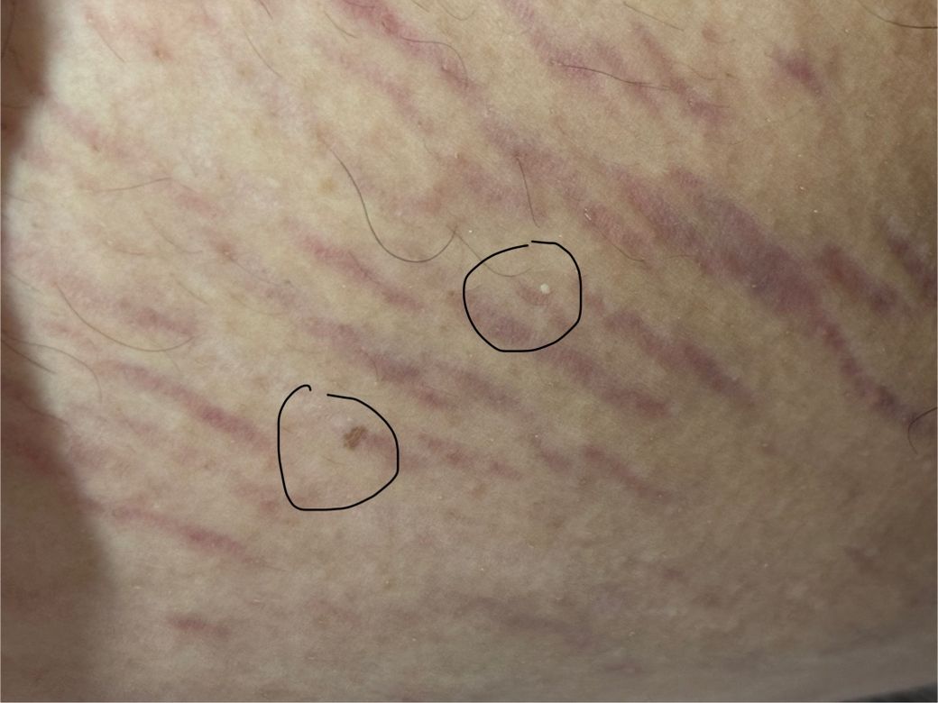 사진은 뾰루지인지 수포엿는지 기억이 잘 안나지만 진물이 나왓고 현재는 저 상태입니다 뾰루지인가요? 두번째 사진과세번째 사지는 각각 왼쪽 오른쪽 허벅지이며 동그라미친 게 무엇인지 궁금합니다 알려주세요!