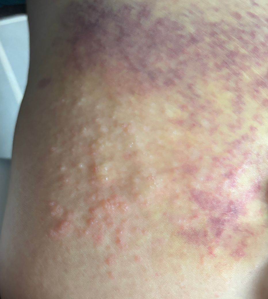 피멍이 이제 서서히 빠지는 중이구요조영술자리에 멍울도 조금씩 작아지고있어요근데 어제부터 피멍든 허벅지부근 밑쪽으로 두드러기가있네요 수포인지 헷갈리네요 간지러워 긁어보니 저렇게되어있네요지금은 딱히간지럽거나