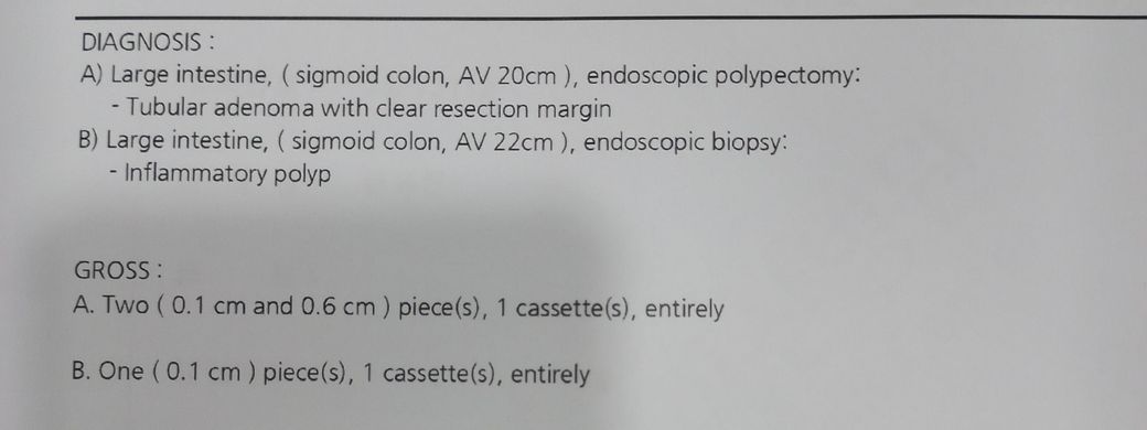 대장에서 2개의 용종이 발견되었고 항문에서 20cm 부근에 위치한 용종을 용종절제술로 제거한 결과 선종성 용종으로 확인되었고 항문에서 22cm 부근에서 관찰된 용종은 조직검사 시행 결과 염증성 용종 소견 입니다.