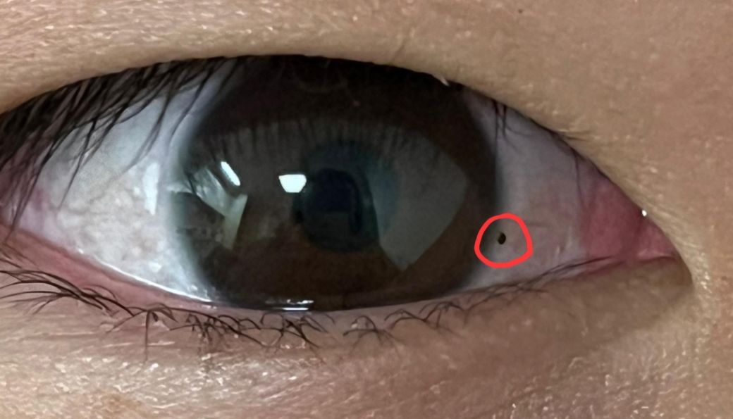 눈에 검은색 점이 생겼어요 동자 바로 옆이라 언제 생겼는지 모르겠어요 처음에는 이물질인 줄 알았는데 손으로 때려고 하니까 안됩니다. 이게 뭘까요?