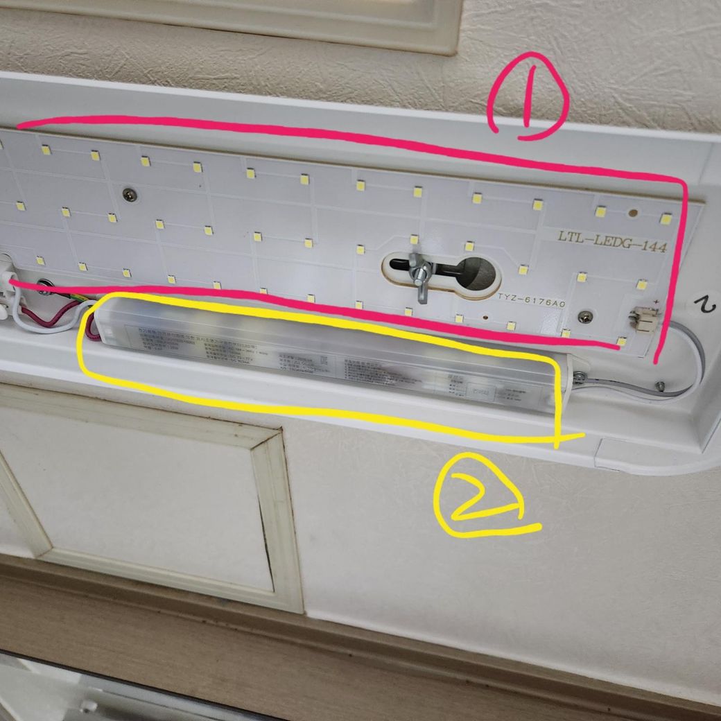 1번으로 표기하신 부분의 led들 중에 한개만 고장나도 불이 안나오기도 하는데, 체크하는 방법은 테스터기가 있어야 가능할것이고, 2번으로 표기한 부분을 교체하는데는 크게 어려움이 없습니다.