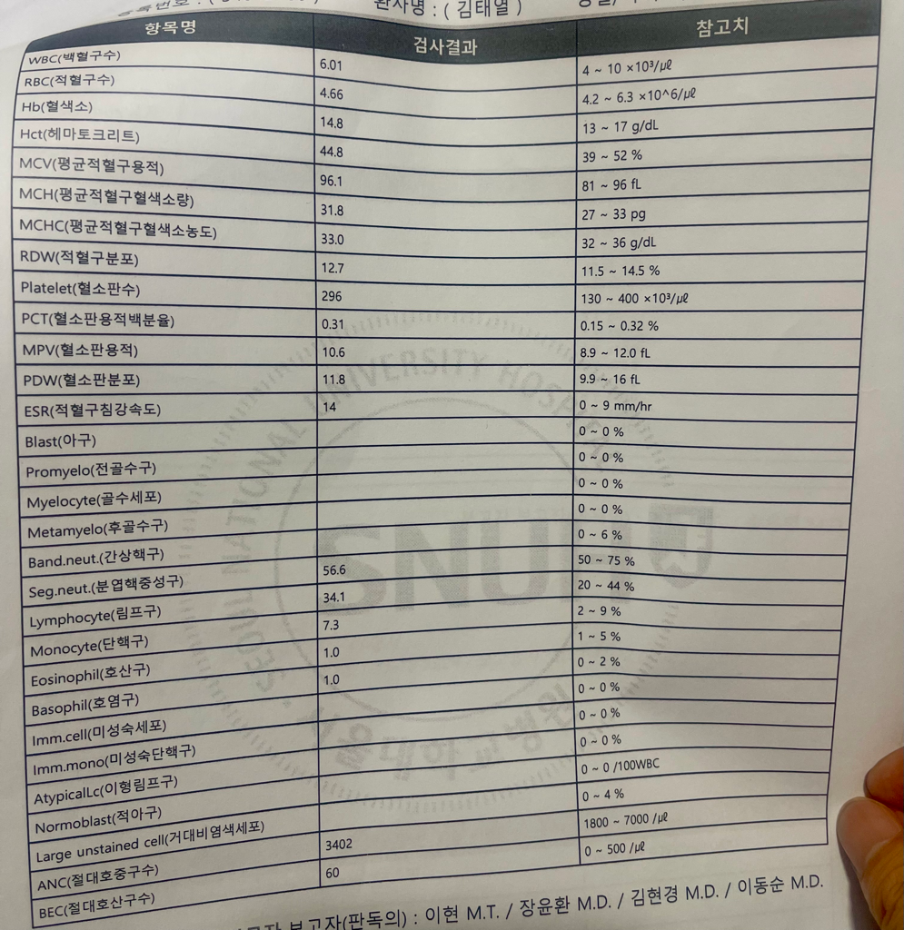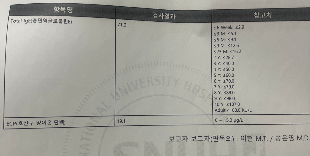 현재 백혈구, 빈혈, 혈소판 수치는 정상이며 알레르기와 연관된 IgE 항체도 정상 범위로 알레르기 질환의 가능성은 낮을 것으로 생각됩니다.