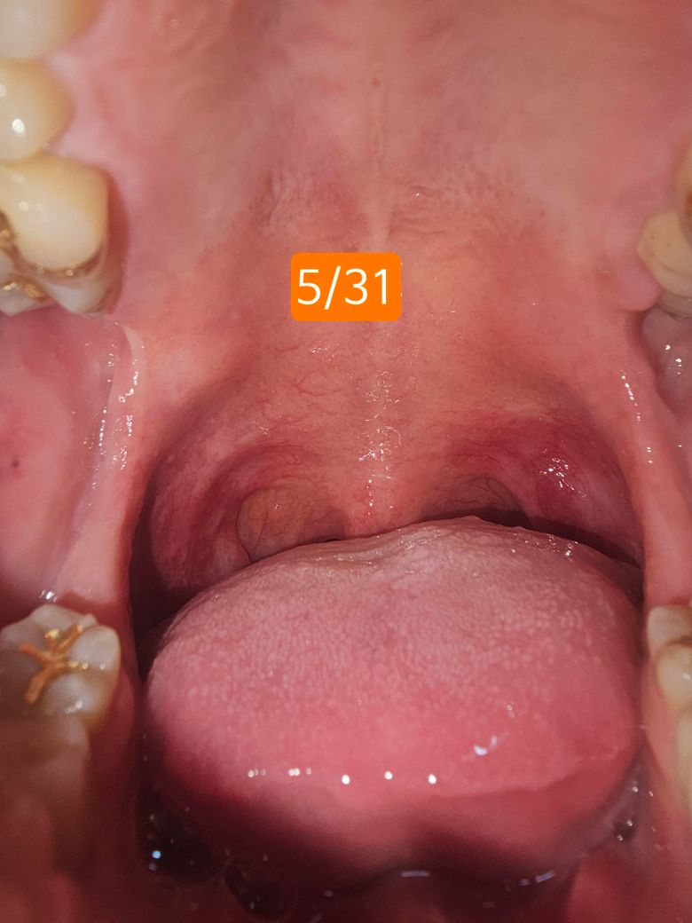 목젖 부위에 자극을 받으면서 생기는 구내염 같습니다. 큰 문제가 잇는건 아니고 최대한 자극을 피해주시면 시간이 지나면 괜찮아 지실꺼에요.