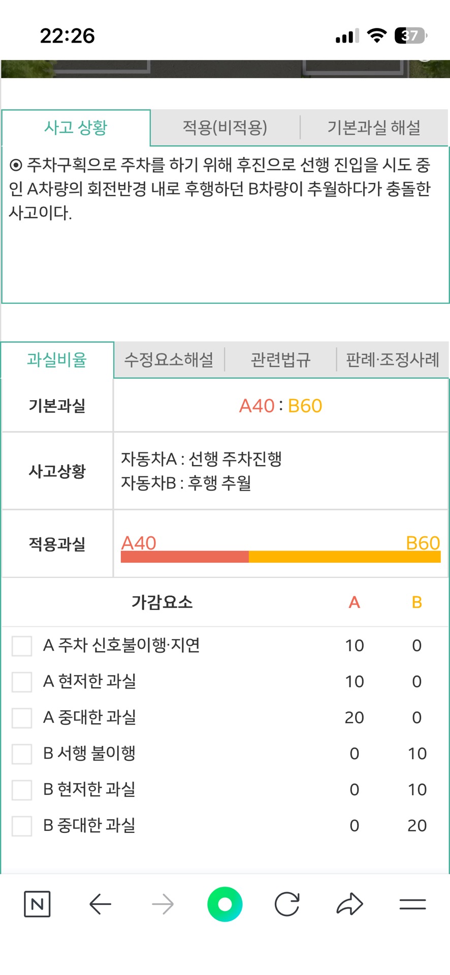 1명 평가일반적으로 선행차량 주차 시도 및 후행차량 추월 사고의 경우 4:6정도로 추월 차량의 과실이 많습니다.