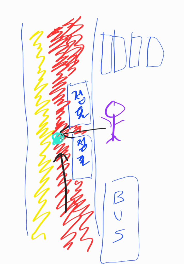 안녕하세요. 저는 PM인증받은 전동 킥보드를 자전거 도로(보행 자 겸용) (인도와 자전거도로는 색깔 및 경계석으로 구분 되어있 음)에서 주행하다가 첨부한 사진 속 BUS 정류장 앞에서 한번 감속하고 혹시 모르게 튀어 나올 사람을 대비해서 경음기를 한번 작동 시킨 뒤 다시 가속하는데 자전거 도로를 일부 차지하고 있던 길거리 점포 사이에서 갑자기 빠른 속도로 뛰어 나오는 보행자와 접촉하는 사고가 발생했습니다.당시 점포는 2곳다 문을 열지 않은 상태였습니다.