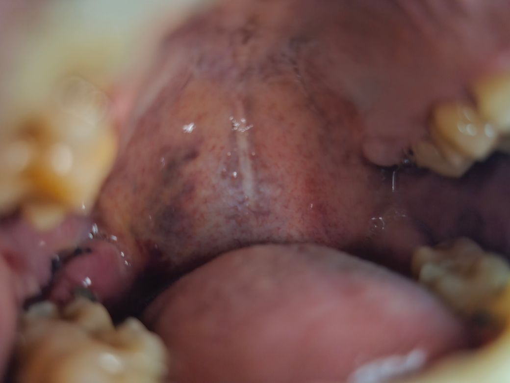 입을 벌려서 보면 입천정? 뒤쪽이 다 멍든것처럼 보입니다.