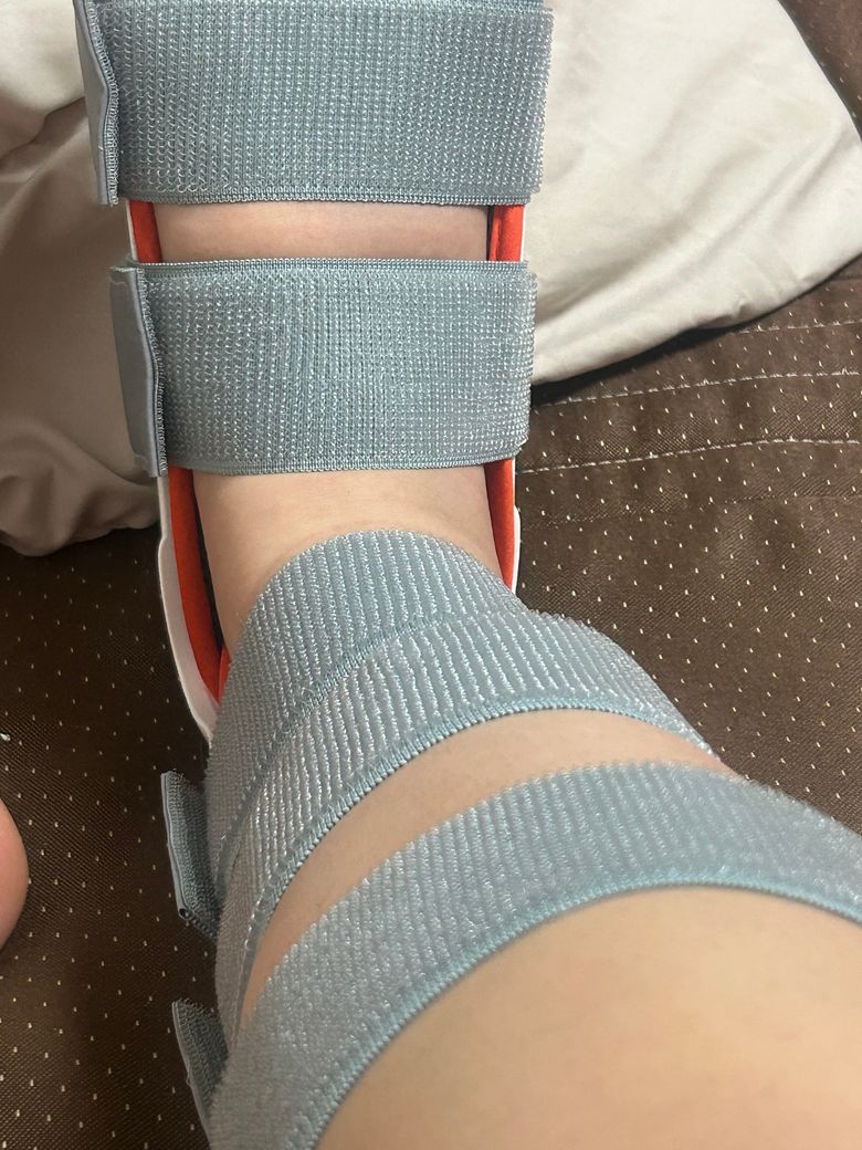 반깁스는 붓기 감소를 고려해 고정력은 유지하되 압박이 심하지 않도록 조절 가능하게 만든 임시 고정 방식으로 맨다리보다는 얇은 양말이나 발토시 착용 후 착용하는 것이 피부 보호에 좋습니다!