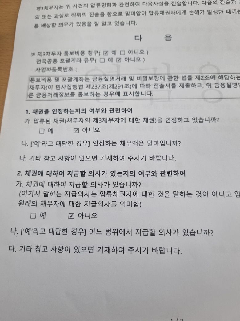 2. 법원에 제3채무자의 진술서에 대한 이의신청을 제기합니다.