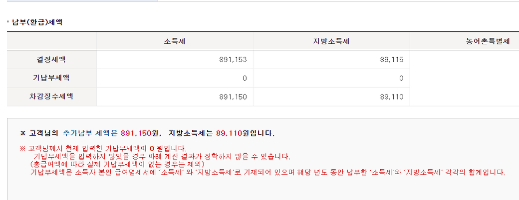 기납부세액이 0 이니 급여를 받을때 정말로 세금을 하나도 안떼고 지급받은 것이면 89만원+8.9만원을 추가로 납부하게 됩니다.