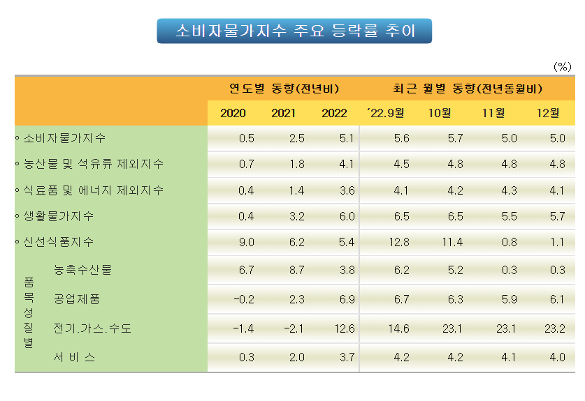 2022년에 가장 물가상승이 높게 발생한 지표는 전기.가스.수도 부문입니다.