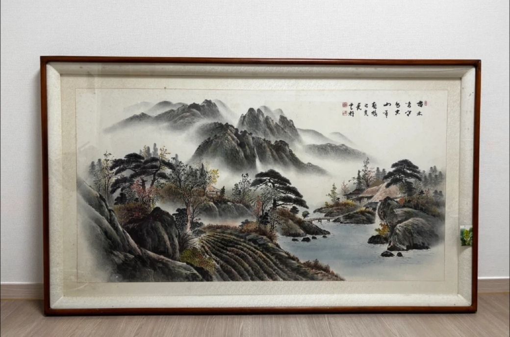 95년 을해년 가을에 남곡 화백님이 정성스럽게 그려낸 아름다운 산수화네요. 안개 낀 산등성이와 평화로운 물가의 풍경이 부모님의 소중한 추억만큼이나 깊이 있고 따뜻하게 느껴집니다. 비록 인증서는 잃어버리셨지만 작품 우측 상단에 남곡이라는 호와 을해년 추일이라는 기록이 명확히 남아 있어 가치는 충분해 보여요. 집안에 평안을 가져다주는 멋진 작품입니다.