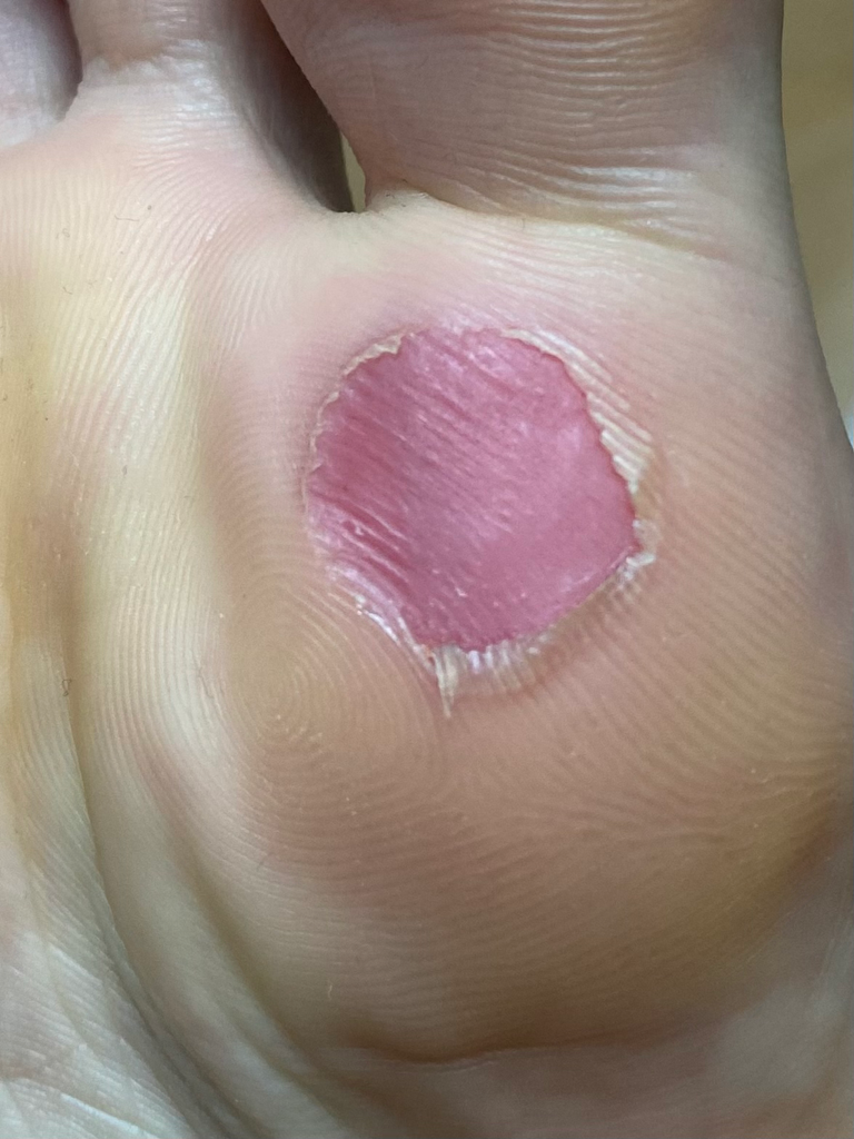 발바닥에 물집이 생겼다가 터진 것 같습니다. 아직은 발바닥이 닿으면 아플 겁니다. 가급적 자극은 최소화