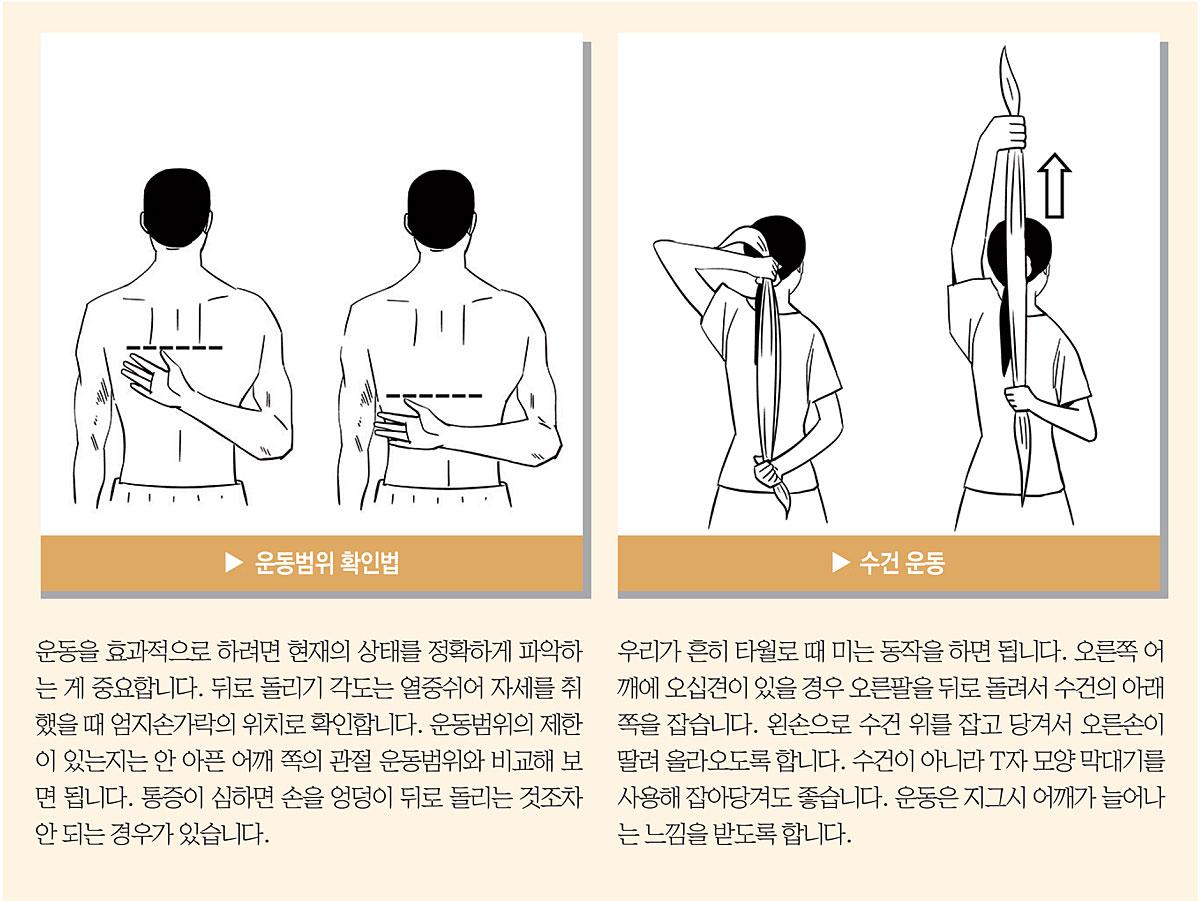 혼자서도 할 수 있는 간단한 운동 몇 가지 말씀드리겠습니다. 1. 수건 스트레칭 – 수건을 양손으로 잡고 등 뒤로 넘긴 뒤, 아픈 쪽 팔은 아래로, 반대 팔은 위로 잡고 천천히 위아래로 움직이세요. 2. 벽 타기 운동 – 벽을 마주보고 손끝으로 벽을 타고 올라가듯 천천히 올렸다가 내리세요. 3. 진자운동 – 허리를 살짝 숙이고 아픈 팔을 아래로 늘어뜨려, 팔을 작은 원 그리듯 가볍게 흔드세요.