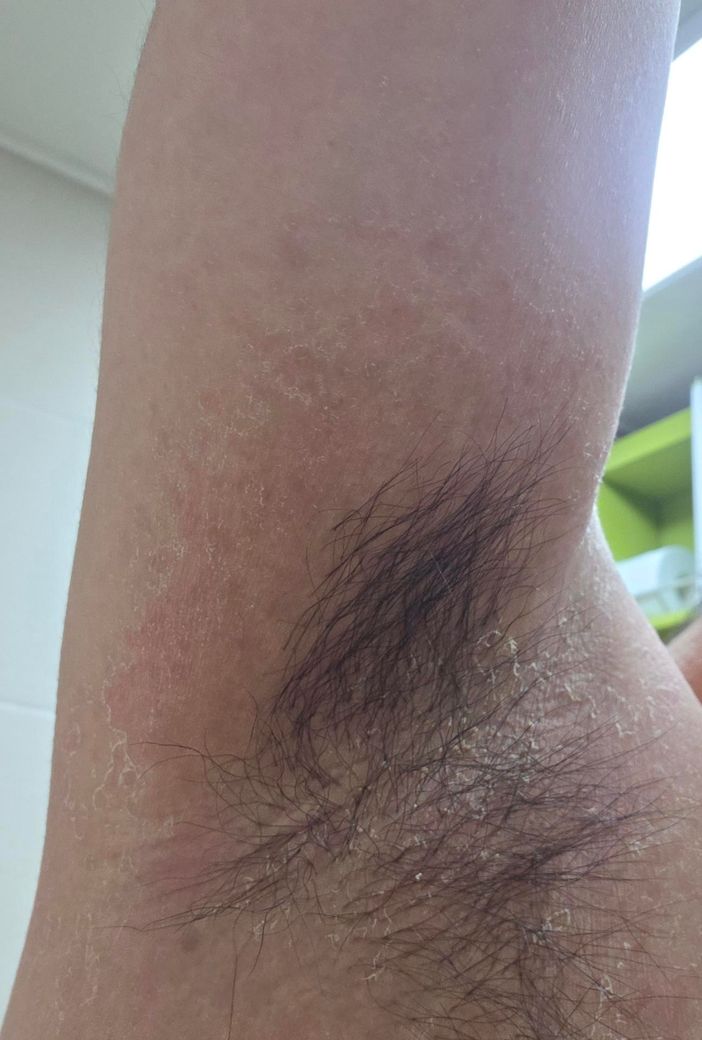 말씀 주신 경과를 종합하면 두드러기 자체는 가라앉고 있고, 현재 문제의 핵심은 겨드랑이·목-등 접히는 부위에 생긴 피부 장벽 손상과 염증으로 보입니다. 햇볕에 탄 뒤 껍질이 벗겨지는 느낌이라는 표현은 급성 습진성 피부염이나 자극/마찰에 의한 접촉피부염에서 흔합니다. 이 부위는 땀, 마찰, 습기로 곰팡이성 질환과 습진이 겹쳐 보이기도 합니다.
