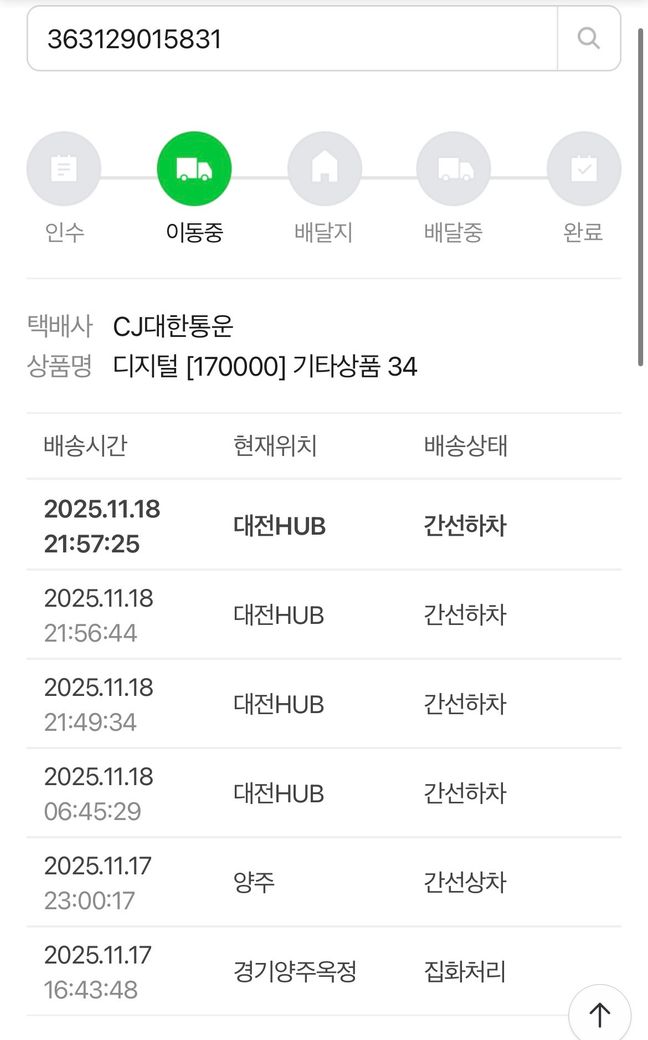 오늘 새벽 6시에 대전hub에서 간선하차했는데 얼마전 10시에 또 간선하차하고 4번이나 간선하차로 뜨는데 이게 뭔가요? 이러면 배송이 언제올까요?..