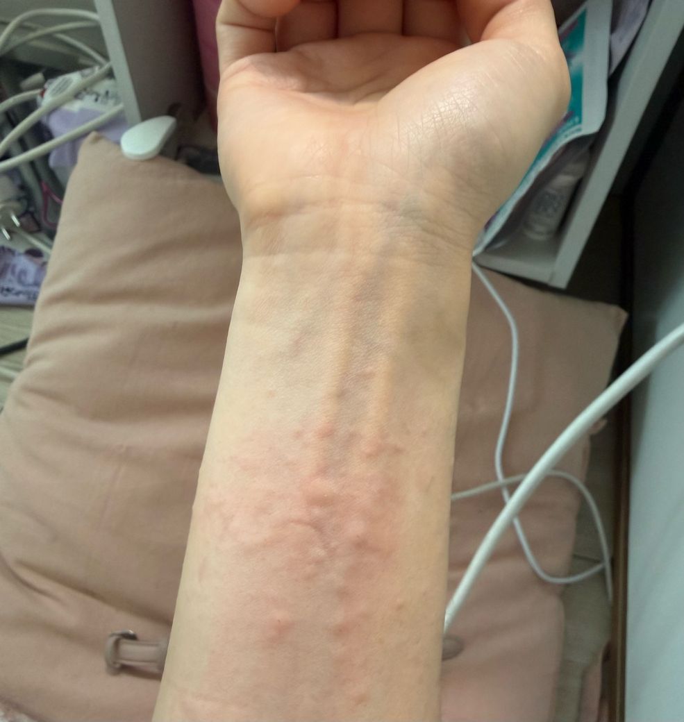 사진상 손목 안쪽에 작은 팽진들이 군집해 있고, 경계가 흐린 홍반 위에 오돌토돌하게 올라온 형태입니다. “갑자기 발생 + 가려움 + 몇 시간~하루 내 변화”라는 점을 고려하면 두드러기(급성 알레르기 반응) 양상이 가장 타당합니다.