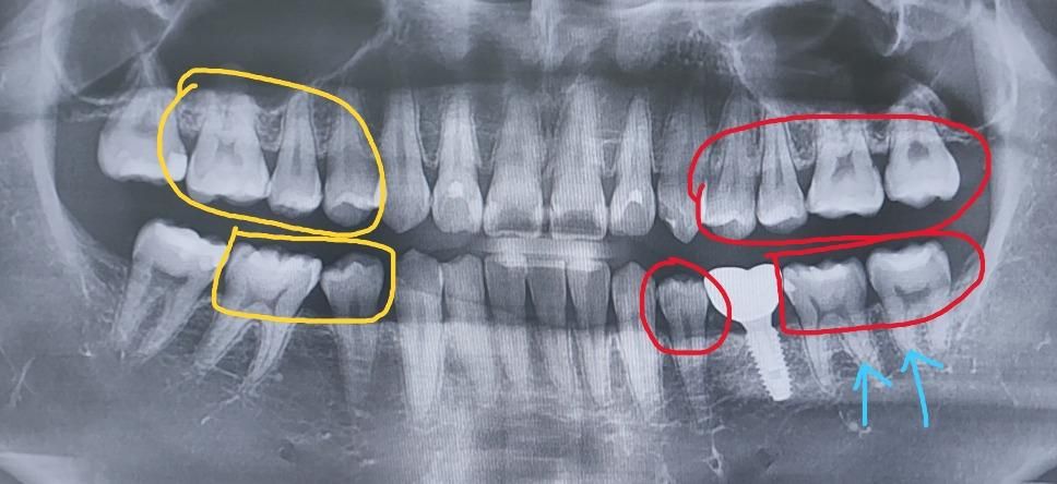 전체적으로 치아 사이에 충치가 약간씩잇고 치료도 많이 받으신거 같습니다. 파노라마 상으로도 빨간색 부분은 치아 사이에 충치가 잇어 보이고 파노라마 사진보다는 더 작은 사진을 찍어보면 충치가 더 자세히 보일것같습니다. 충치가 잇으면 인레이 치료를 하시는게 좋습니다.