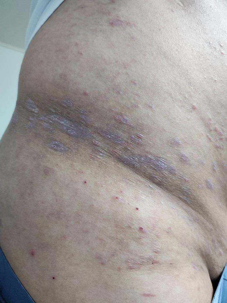 피부 착색과 함께 피부가 두꺼워 지는 태선화가 관찰되어 만성 피부염에 의한 변화로 판단할 수 있습니다. 만성 피부염은 다양한 질환에 의해 유발될 수 있는 알러지 피부염,건선과 같은 질환이 대표적입니다. 하지만 육안적 소견만으로는 이러한 피부 질환을 감별하는 것은 어려움이 있어 일반적으로 상기 병변의 경우에는 국소 스테로이드 제재와 같은 약물 치료를 하는 것이 대부분입니다. 하지만 치료에 호전이 없고 오히려 병변이 악화되었다면 조직검사 등 추가 검사를 고려해야 하므로 상급병원 피부과 진료를 보시는 것을 권해드립니다. 부족한 답변이지만 도움이 되었기를 바랍니다.