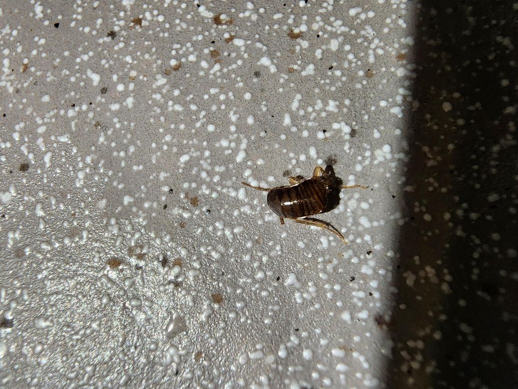 바퀴벌레 유충처럼 보입니다. 몸이 납작하고 갈색빛이 도는 반투명한껍질은 습한공간에서 자주 출현하는 초기 성장단계의 특징이라고 볼 수 있습니다.