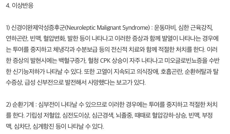 항정신병제 복용 중 드물게 나타나지면 치명적이기 때문에 적혀있는 부작용으로 0.7%~2.2% 와 같이 소수에게 나타나며 복용 초기에 나타납니다.