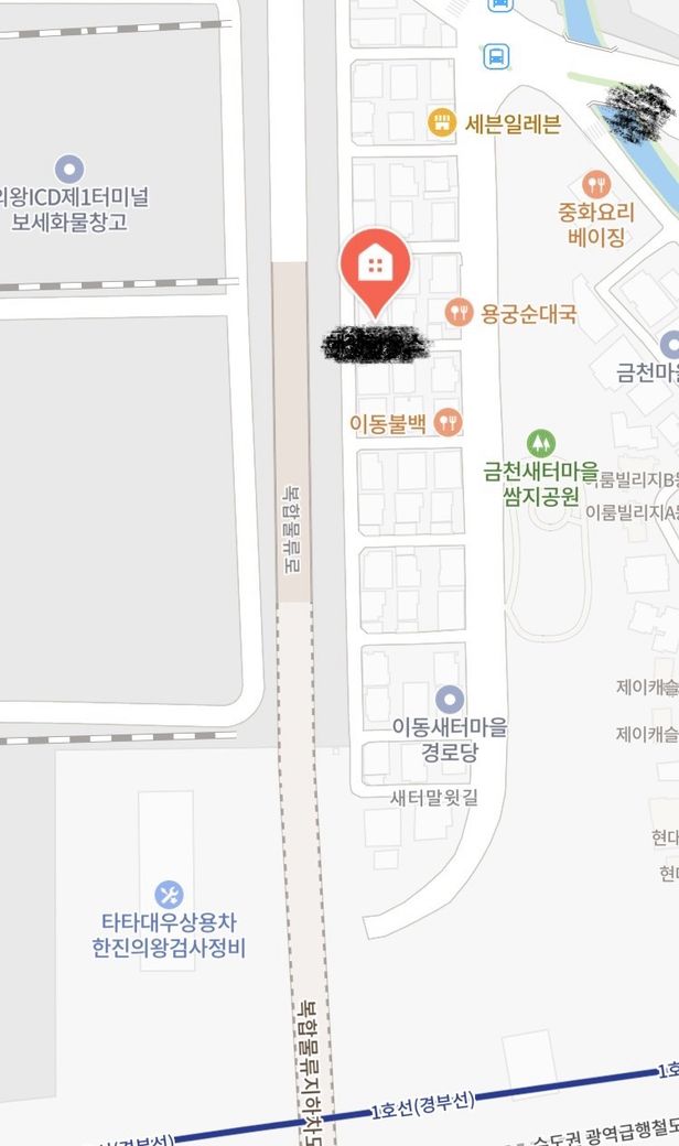 첨부하신 지도를 보면, 말씀하신 의왕 ICD 제1터미널 보세화물창고, 즉 복합물류단지 바로 옆에 위치한 주거지입니다.