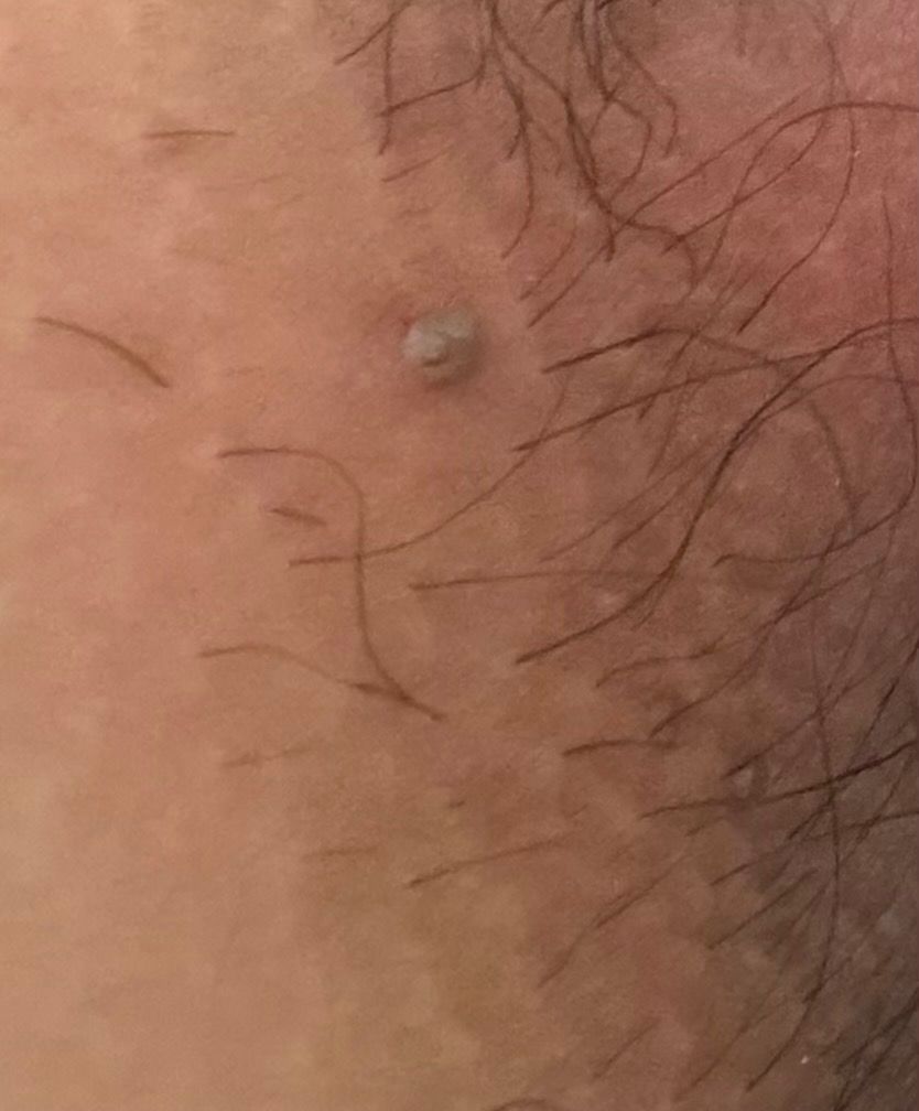 또 하나 고려할 수 있는 것은 모낭염이나 피지낭종 초기 형태입니다. 특히 털이 있는 부위이고, 중심이 약간 하얗게 보이는 점은 이런 가능성도 있습니다.