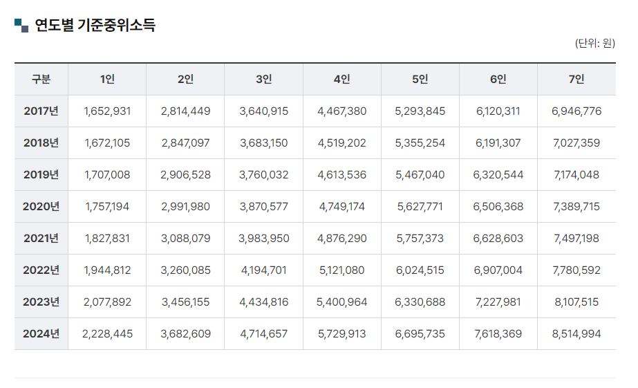 기준 중위소득 표는 아래와 같습니다. 기재하신 계산된 급여와 아래 표를 참고하시면 됩니다.